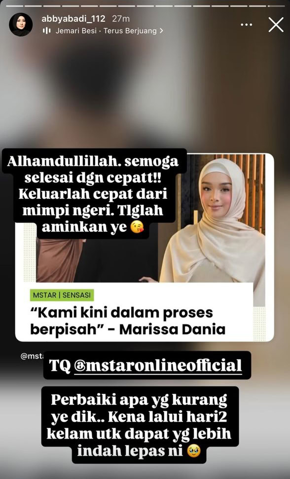 Menerusi hantaran di Insta Story, Abby memohon agar urusan tersebut segera selesai dan anak tersayang cepat keluar dari mimpi ngeri tersebut.