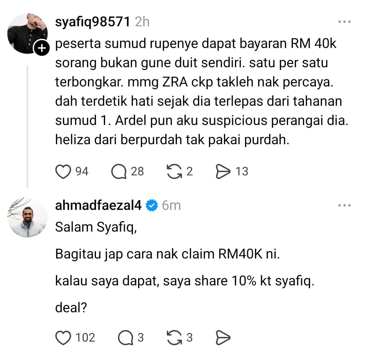 “Kalau saya dapat, saya kongsi 10% dekat Syafiq. Deal?” tulisnya.