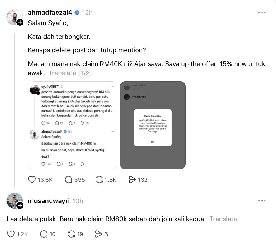 “Laa delete pulak. Baru nak claim RM80k sebab dah join kali kedua,” tulisnya.