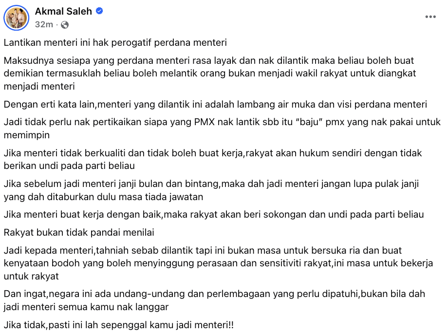 Menerusi hantaran yang dikongsi Akmal di Facebook, beliau memaklumkan Perdana Menteri boleh melantik sesiapa sahaja yang beliau rasakan layak untuk menjadi sebahagian daripada Jemaah Menteri yang ada di dalam kabinet beliau.