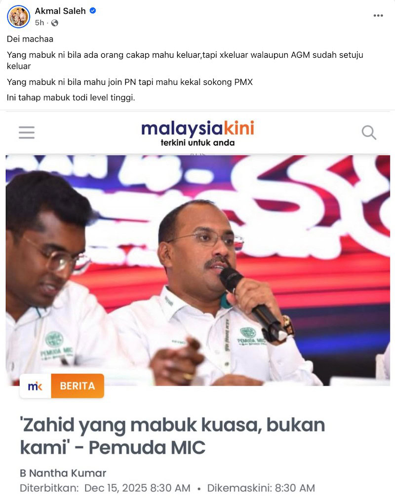 Ketua Pemuda UMNO, Datuk Dr Muhamad Akmal Saleh menyindir sikap MIC yang dilihat tidak konsisten dalam membuat keputusan berhubung isu keluar daripada Barisan Nasional (BN).