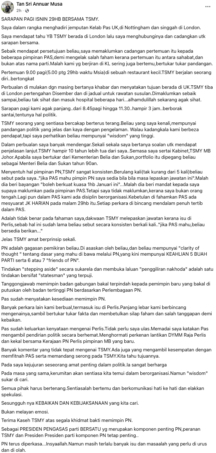 Menerusi hantaran Annuar, yang juga Ahli Jawatankuasa PAS Pusat di Facebook, beliau menyatakan Muhyiddin memberi bayangan peletakan jawatan itu boleh berkuat kuasa pada 1 Januari 2026.
