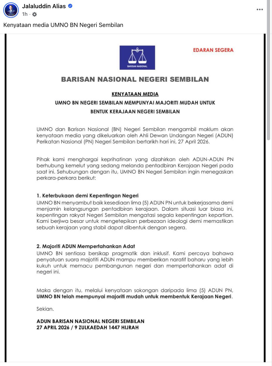 “Dalam situasi luar biasa ini, kepentingan rakyat Negeri Sembilan mengatasi segala kepentingan parti.