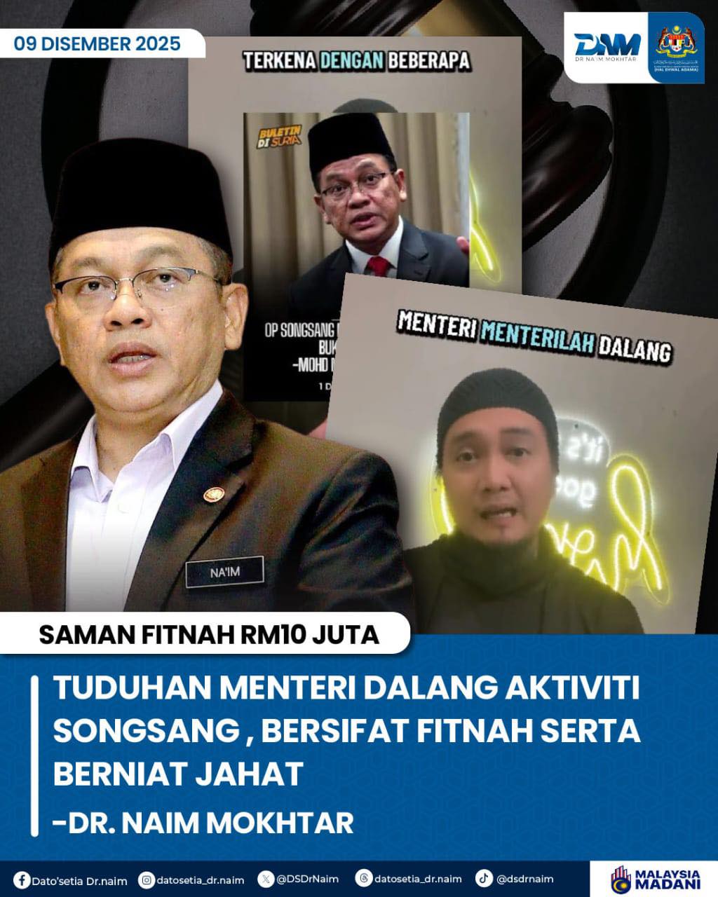 Menteri di Jabatan Perdana Menteri (Hal Ehwal Agama), Datuk Dr Mohd Na’im Mokhtar memulakan tindakan undang-undang terhadap seorang pengguna media sosial yang menuduhnya dalang aktiviti songsang.