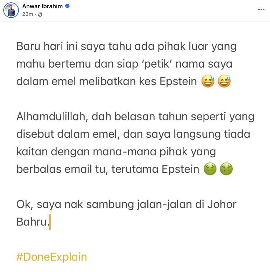 Menerusi posting tersebut, Anwar memberi penjelasan ringkas dengan memaklumkan bahawa baru hari ini beliau mendengar namanya disebut oleh pihak luar yang dikatakan mahu bertemu dengannya menerusi satu email melibatkan kes Epstein.