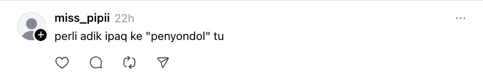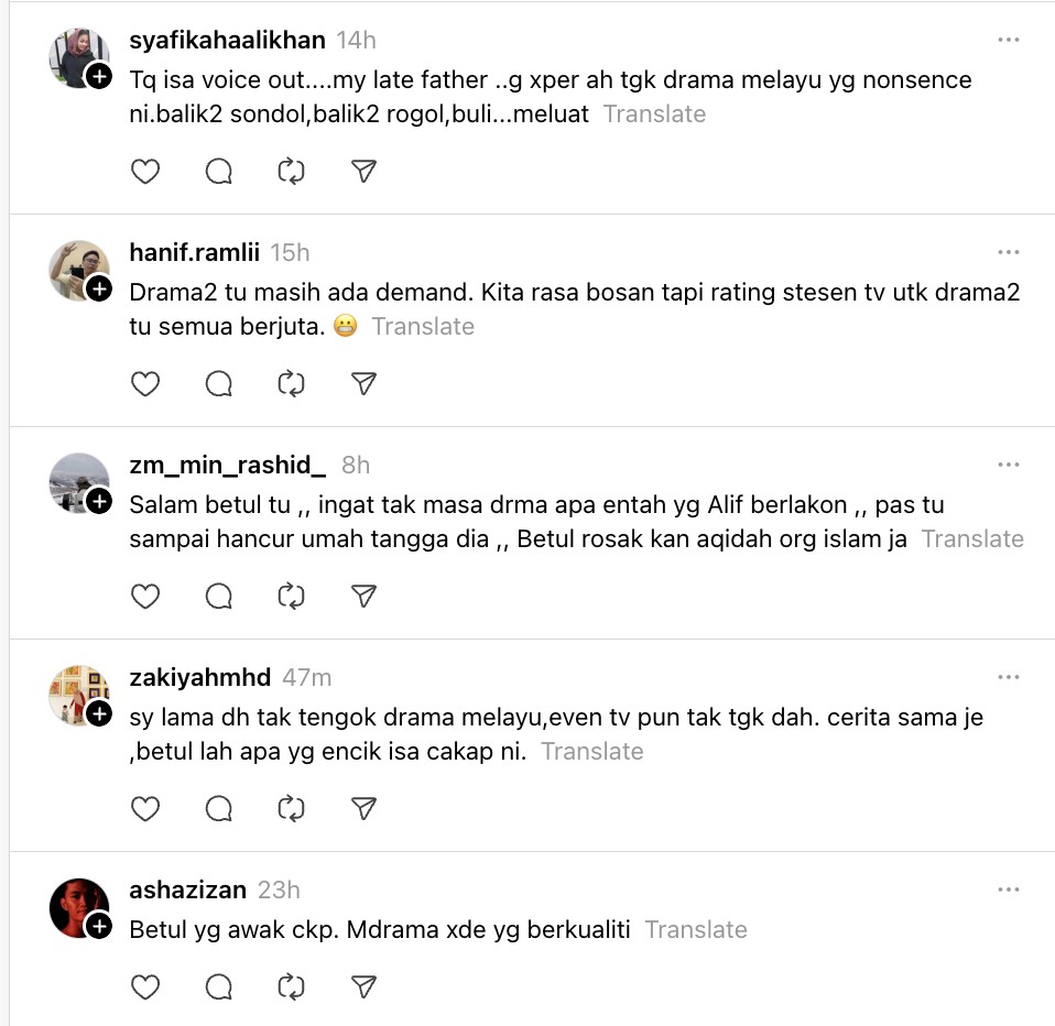 “Drama TV ni untuk tontonan umum budak kecil pun tengok. Tak habis habis cerita fasal penyondol tak peliklah ramai orang menyampah dan tak tengok TV dah” ujarnya menerusi platform Threads.