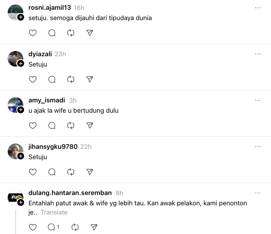 Namun terdapat juga komen yang menyindir agar aktor itu menasihati isterinya dan adik iparnya sendiri iaitu Ruhainies.