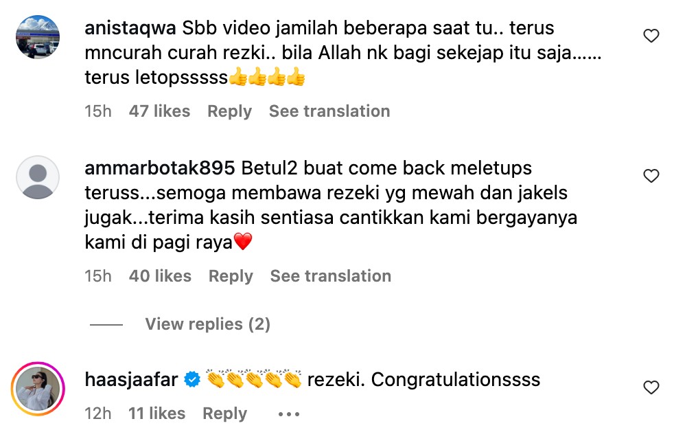 Menjengah ke ruangan komen, rata-rata netizen dan rakan artis menzahirkan ucapan tahniah kepada Que dan siapa sangka rezekinya kian mencurah selepas tularnya video Jamilah, baru-baru ini.