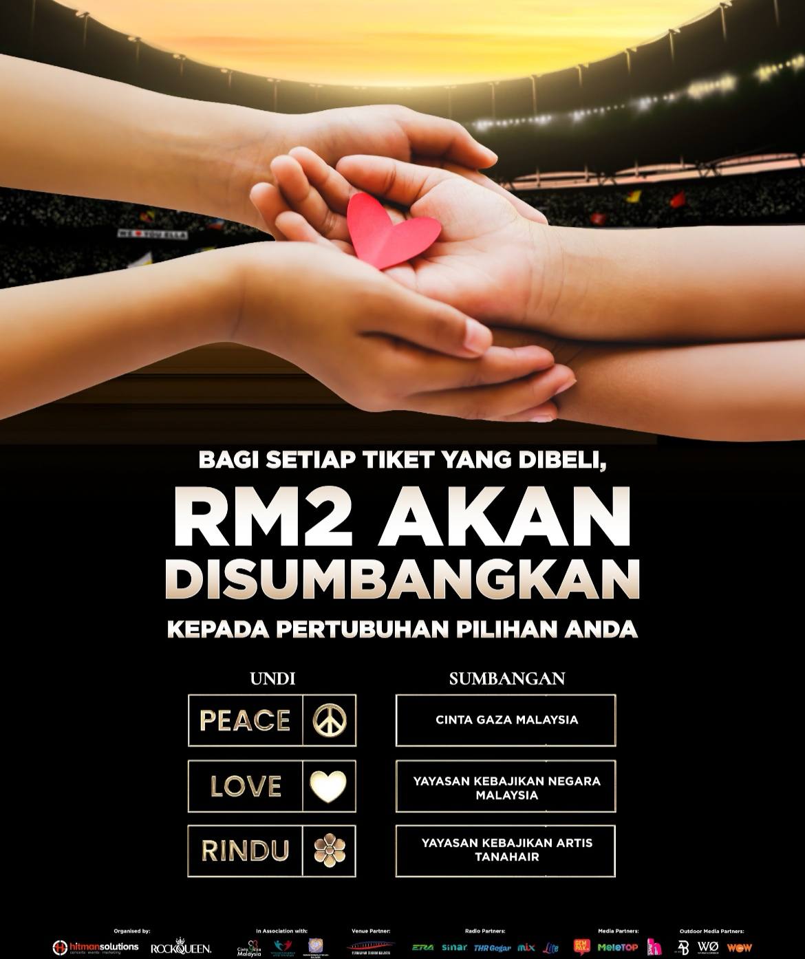 “Setiap pembelian tiket akan dikehendaki untuk mengundi dan memilih tabung sumbangan pilihan mereka sama ada Peace (Persatuan Cinta Gaza Malaysia), Love (Yayasan Kebajikan Negara) atau Rindu (Yayasan Kebajikan Artis Tanahair) pada waktu pembelian.