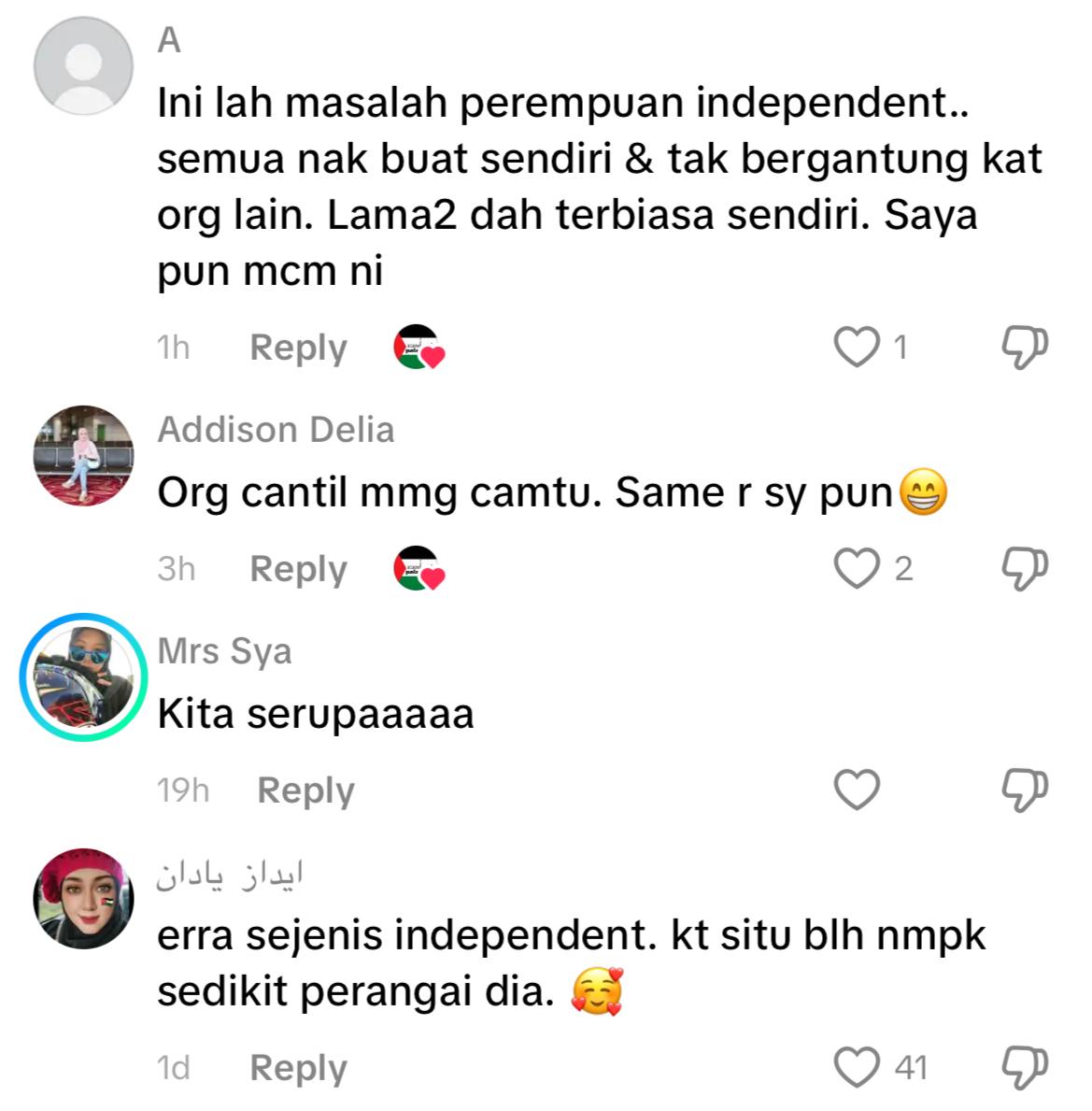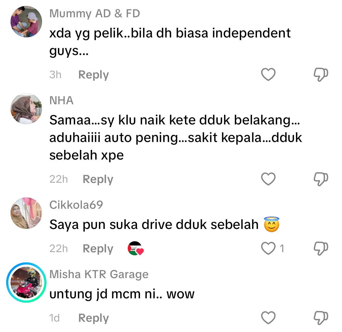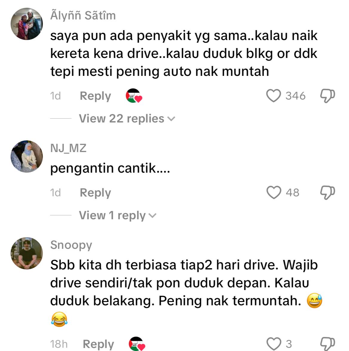 Menjengah ke ruangan komen, warganet memuji sikap berdikari yang ditunjukkan oleh pelakon itu dan ada juga yang berkongsi tabiat yang sama iaitu mudah pening sekiranya berada di bahagian kerusi penumpang.