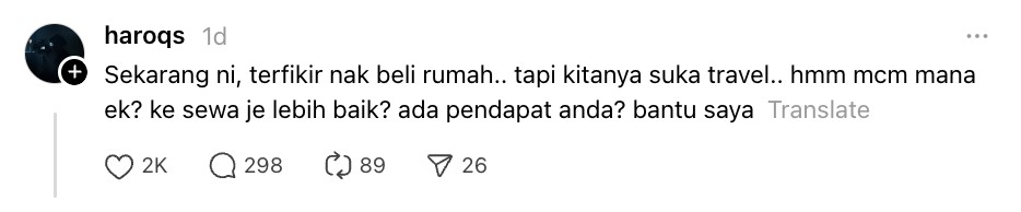 “Sewa – selagi mana belum decide nak settle down kat mana and cukup cash hehe.. Ramai orang akan cakap rugi tak beli rumah muda2 tapi kalau sampai terpaksa buat loan, kita dah terlibat dengan riba, lagi rugi dekat akhirat nanti,” tulisnya lagi.