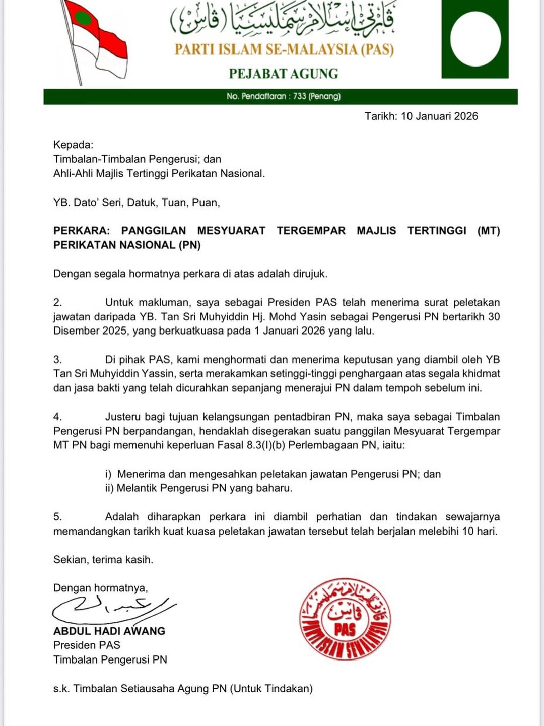 “Saya sebagai Presiden PAS sudah menerima surat peletakan jawatan Muhyiddin sebagai Pengerusi, bertarikh 30 Disember 2025 yang berkuat kuasa pada 1 Januari lalu.