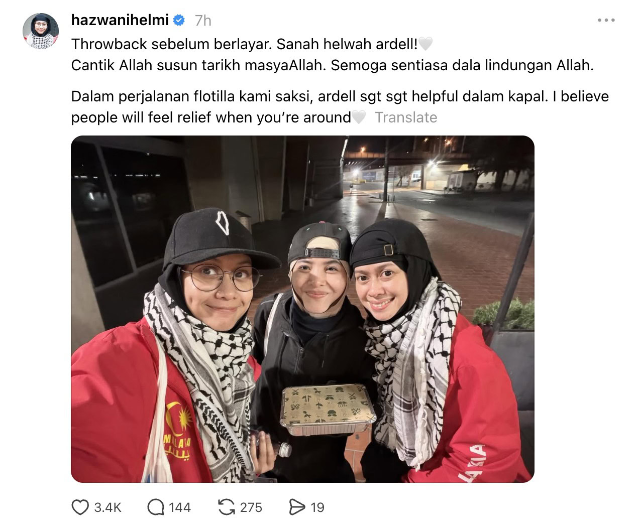 Aktivis  kemanusiaan dan juga pelakon, Hazwani Helmi, menzahirkan ucapan istimewa sempena hari lahir rakan seperjuangannya, Ardell Aryana, ketika mereka sama-sama terlibat dalam misi kemanusiaan, Global Sumud Flotill 2.0.