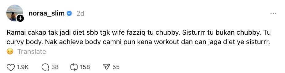 “Ramai cakap tak jadi diet sebab tengok isteri Fazziq tu ‘chubby’. Sistur tu bukan ‘chubby’. Tu ‘curvy body’