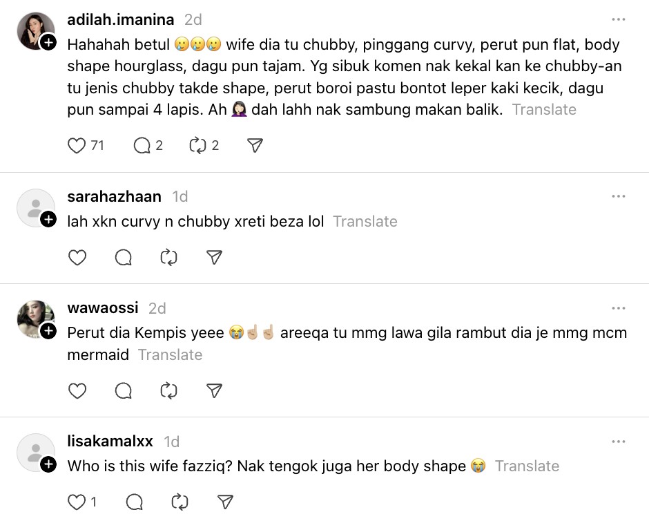 Menerusi hantaran netizen di Thread dikenali sebagai noraa_salim, dia menyatakan bahawa isteri Fazziq bukan ‘chubby’ atau berisi, tetapi ‘curvy body’.