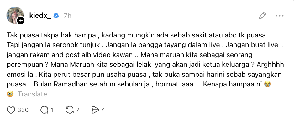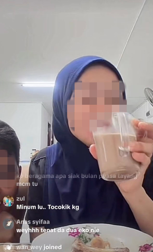 “Tak puasa tak mengapa, itu hak anda. Kadang mungkin sebab sakit atau datang bulan. Tapi jangan la seronok tunjuk. Jangan la bangga tayang dalam live. Jangan buat live dan rakam muat naik aib video kawan.