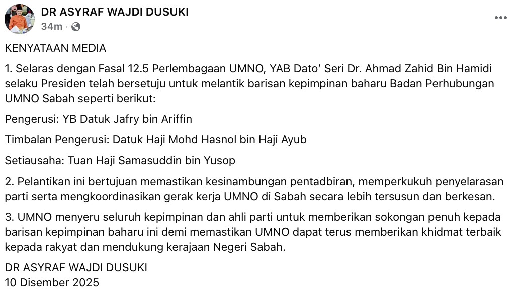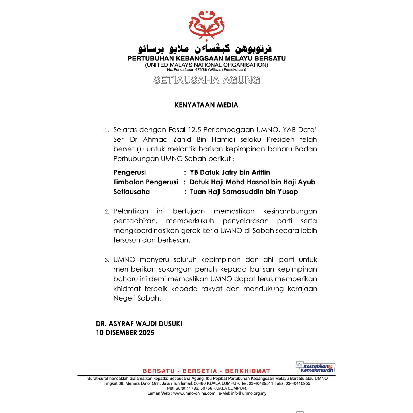 Menurut Dr. Asyraf, pelantikan ini bertujuan memastikan kesinambungan pentadbiran, memperkukuh penyelarasan parti serta mengkoordinasikan gerak kerja UMNO di Sabah secara lebih tersusun dan berkesan.