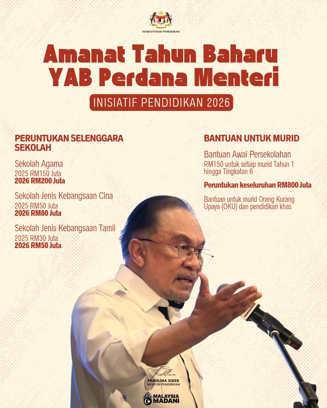 Menterinya, Fadhlina Sidek berkata, amanat tersebut turut menekankan usaha berterusan Kerajaan MADANI untuk memperluas akses pendidikan kepada semua murid.