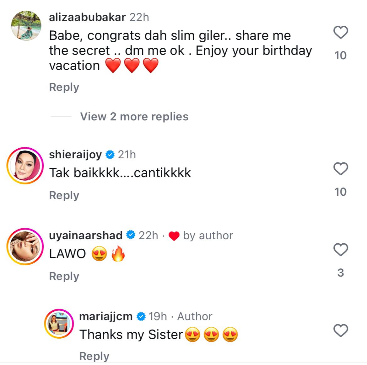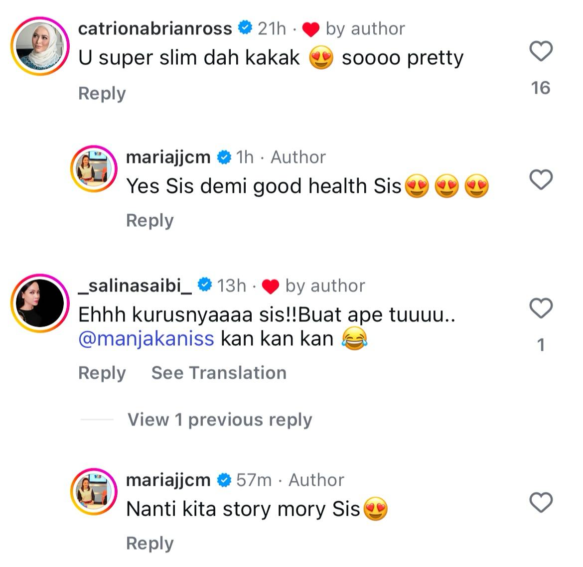 Menelusuri ke ruangan komen, wargamaya memuji Maria yang kelihatan lebih cantik dengan imej yang baharu dan ada juga yang meminta tip penjagaan tubuh badan yang lebih baik.