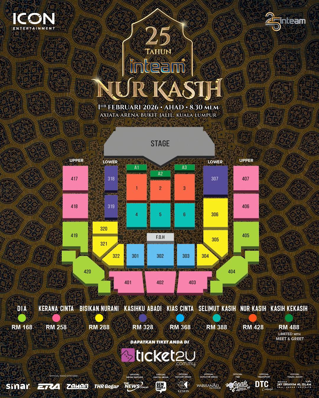 Untuk info, harga dan kategori tiket 25 Tahun Inteam Nur Kasih bermula serendah RM168 (DIA), RM258 (KERANA CINTA), RM288 (BISIKAN NURANI), RM328 (KASIHKU ABADI), RM368 (KIAS CINTA), RM388 (SELIMUT KASIH), RM428 (NUR KASIH), RM488 (KASIH