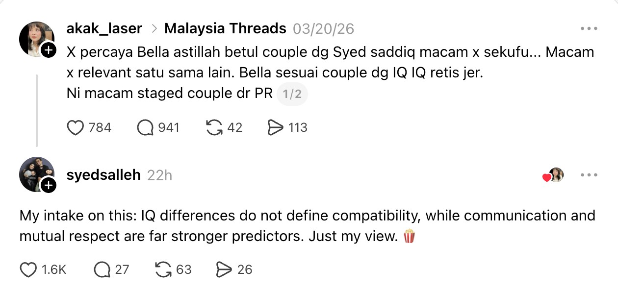 Menerusi perkongsian di Threads, individu berkenaan mempersoalkan keserasian mereka selain mendakwa pasangan itu tidak sekufu dan kelihatan seperti sekadar gimik.