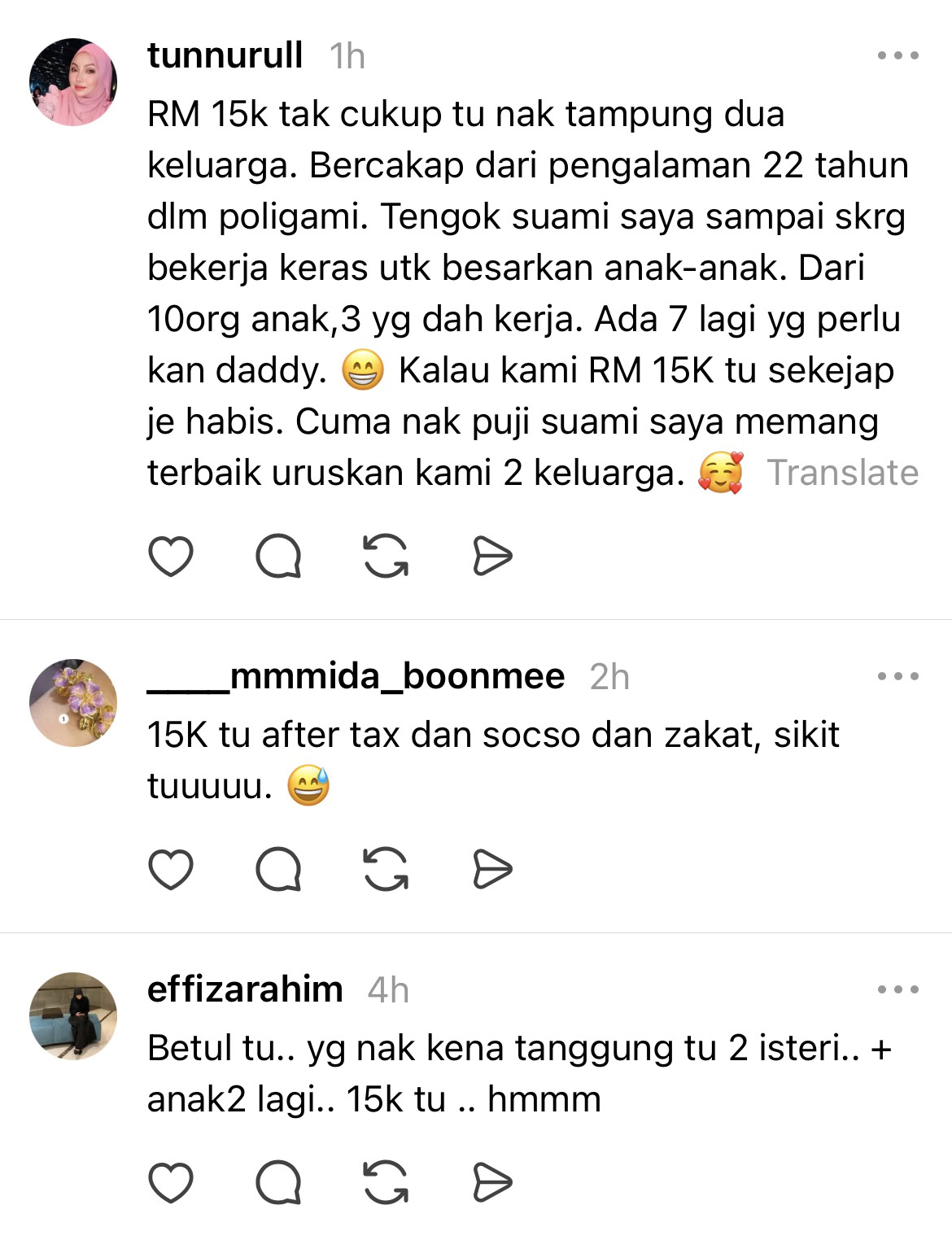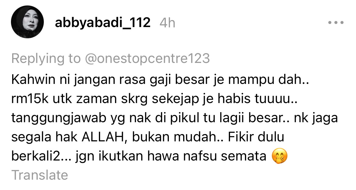 “Kahwin ni jangan rasa gaji besar je mampu dah. RM15K untuk zaman sekarang sekejap je habis tu. Tanggungjawab yang nak dipikul tu lagi besar.