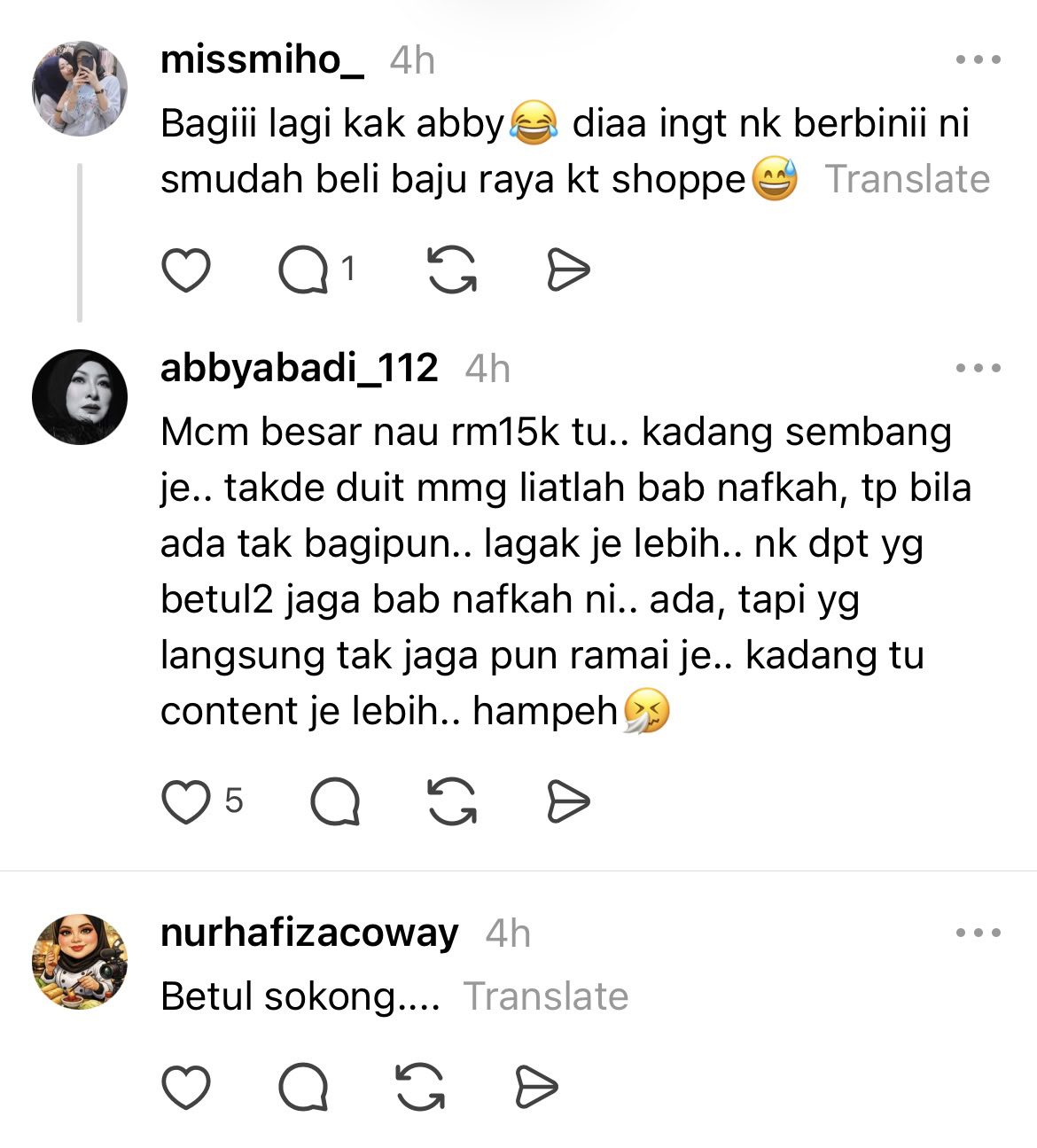 Terdahulu, Abby mencuri perhatian warganet apabila menegaskan pendedahannya mengenai isu mas kahwin tertangguh bukan bertujuan mengaibkan bekas suaminya, aktor Norman Hakim, sebaliknya sebagai peringatan agar tanggungjawab diselesaikan selagi masih bernyawa.