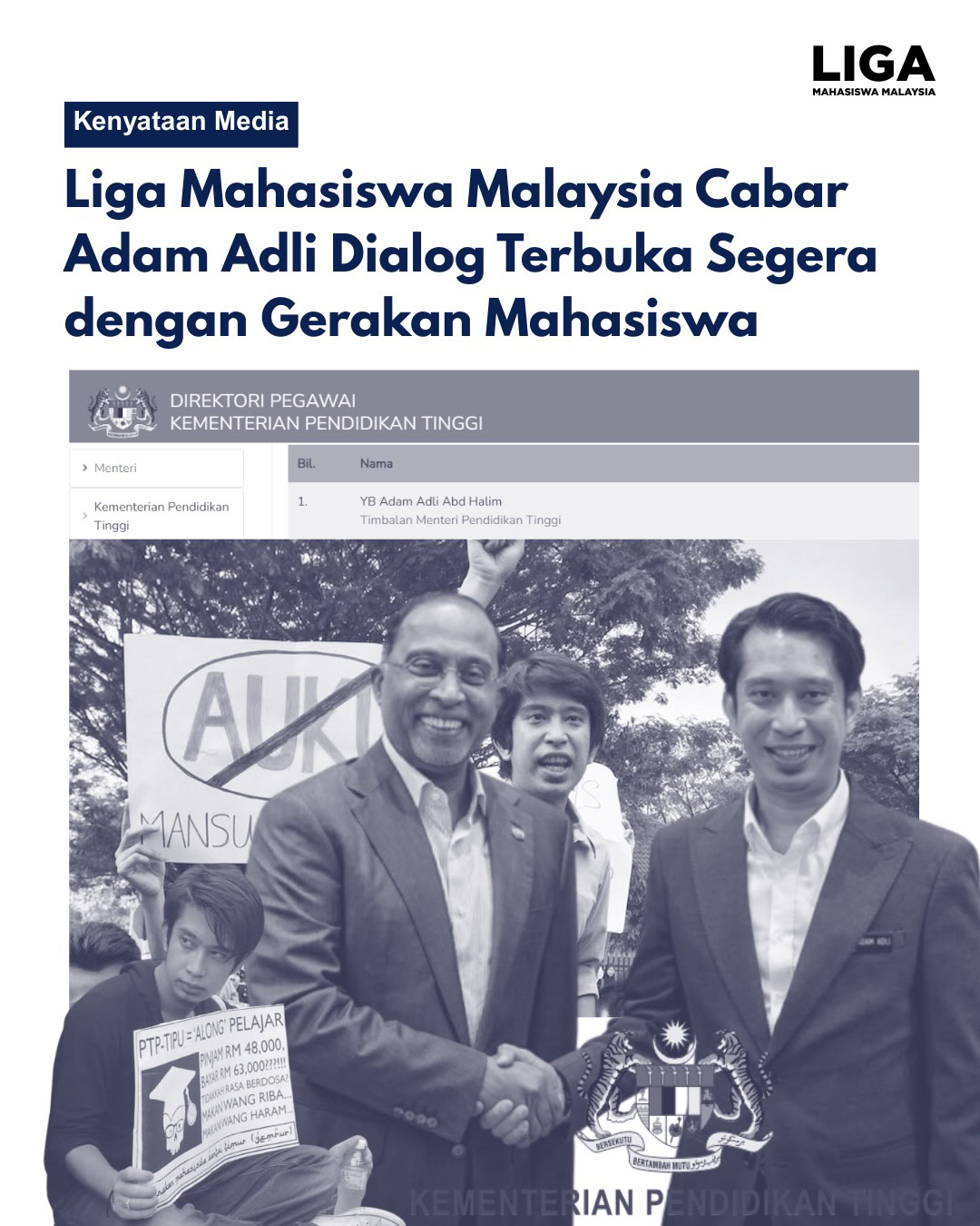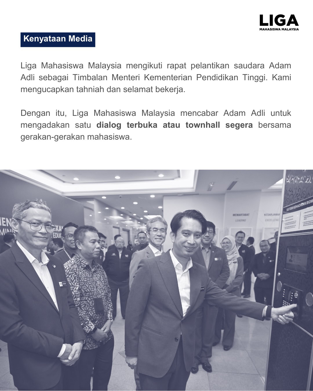 Timbalan Menteri Pengajian Tinggi, Adam Adli Abdul Halim, bersetuju menerima jemputan Liga Mahasiswa Malaysia (LMM) untuk mengadakan dialog terbuka bersama mahasiswa.