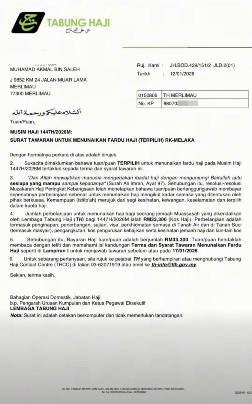 Beliau turut berkongsi tangkap layar surat tawaran yang diterima untuk menunaikan ibadah haji bagi musim 2026.