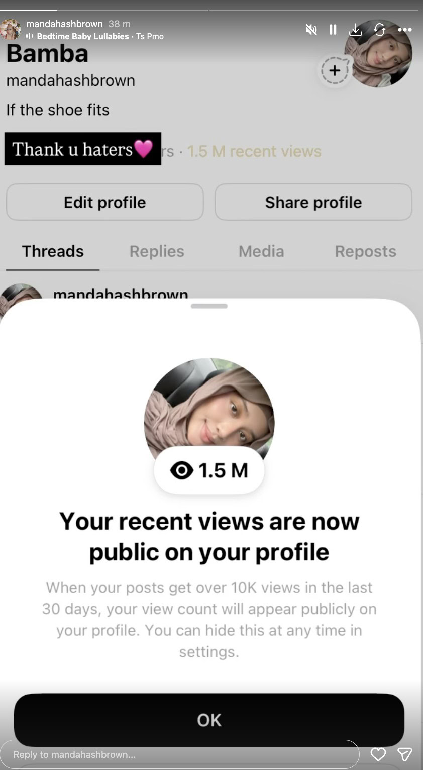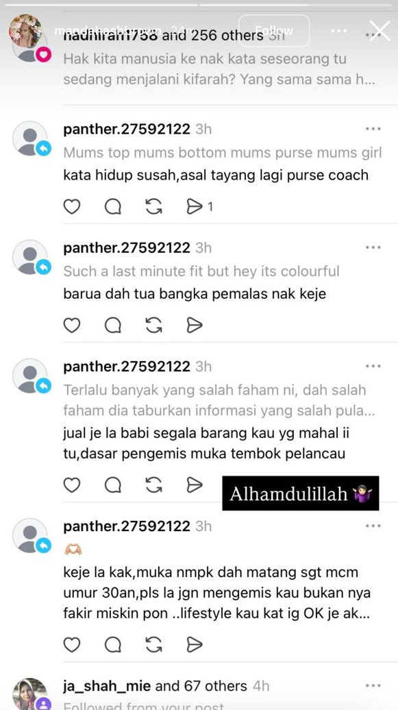 Menerusi hantaran di Insta Story, Manda hanya menjawab ‘Alhamdulillah’ apabila dilemparkan pelbagai kata-kata tidak baik di media sosial.
