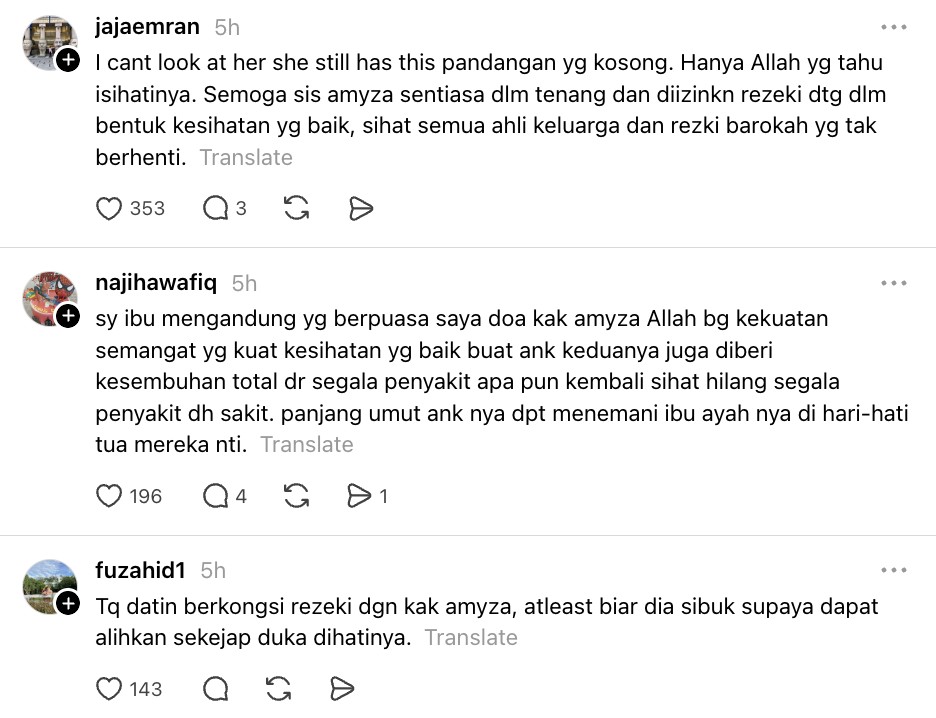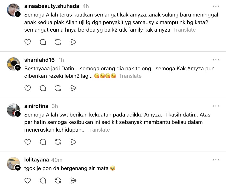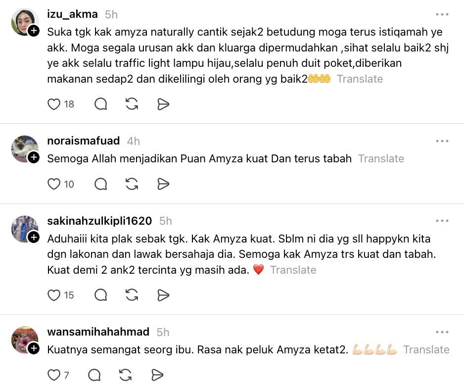Menjengah ke ruangan komen, ramai yang kagum dengan semangat Amyza walaupun baru sahaja kehilangan insan tersayang dan seorang lagi anak juga sedang berjuang melawan penyakit.
