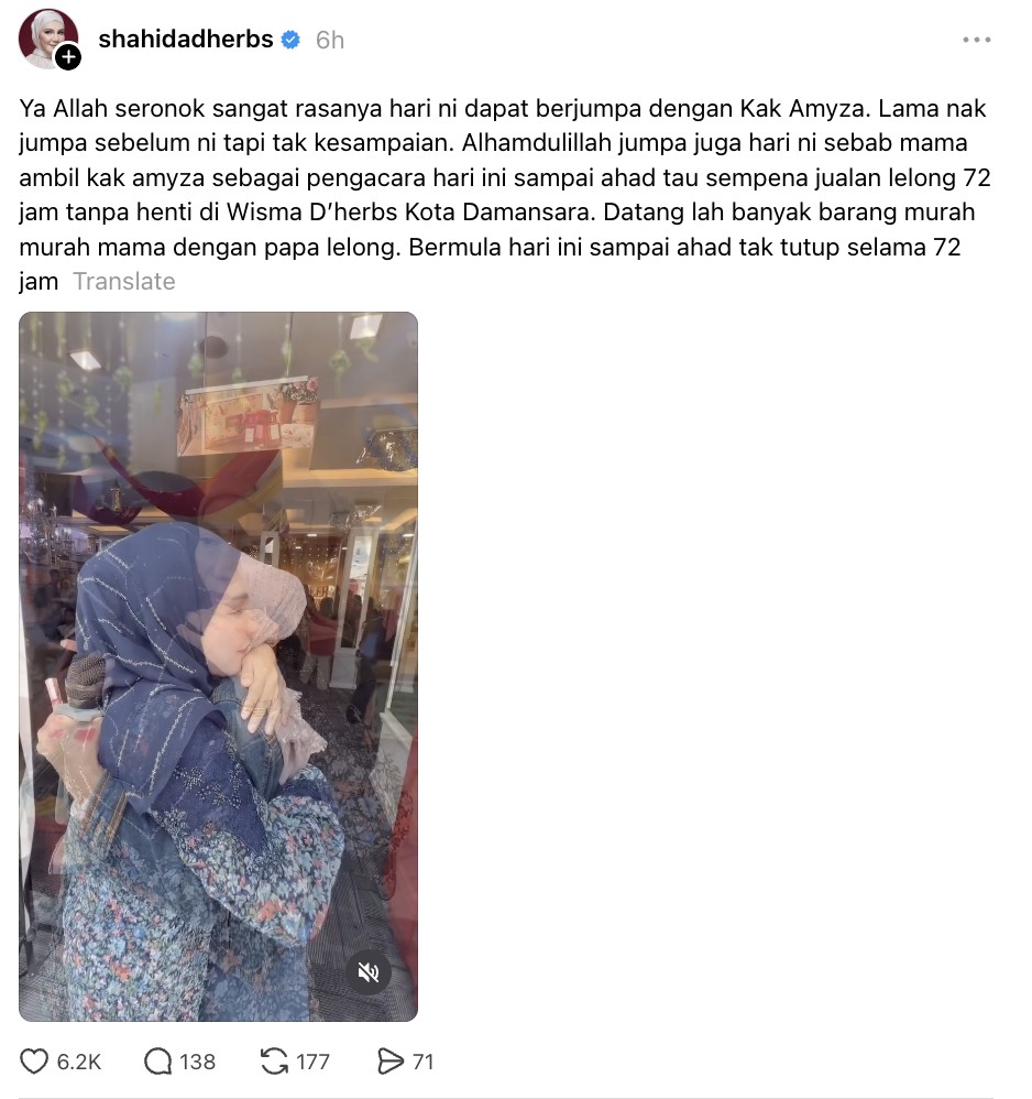 “Lama nak jumpa sebelum ni tapi tak kesampaian. Alhamdulillah jumpa juga hari ni sebab mama ambil kak amyza sebagai pengacara hari ini sampai ahad tau sempena jualan lelong 72 jam tanpa henti di Wisma D’herbs Kota Damansara,” tulisnya.