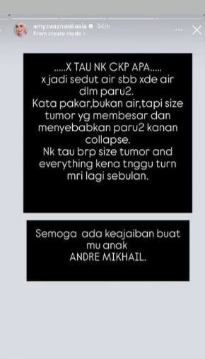 Pelakon Amyza Aznan memaklumkan perkembangan terbaharu mengenai keadaan anaknya, Andre Mikhail, yang kini sedang berjuang melawan kanser paru-paru.