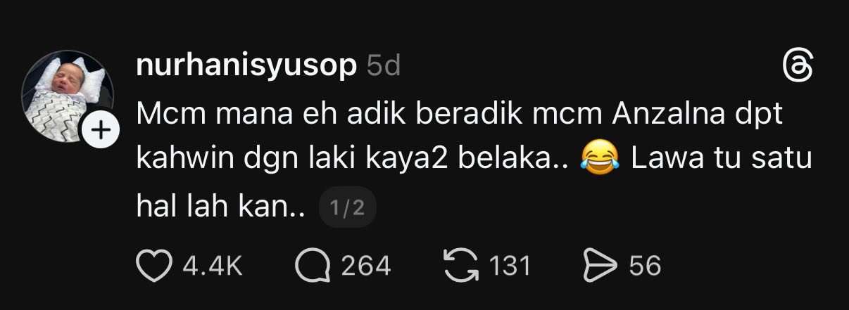 “Macam mana eh adik-beradik macam Anzalna dapat kahwin dengan lelaki kaya-kaya belaka.
