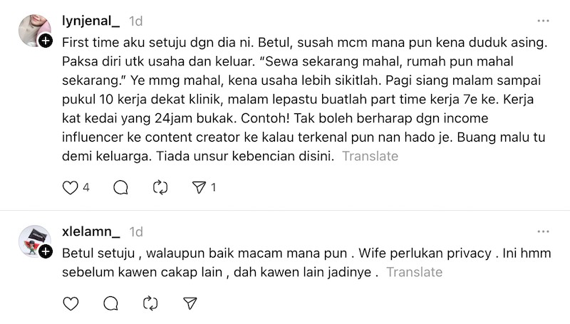 “Privasi untuk suami dan isteri tu penting ya. Bila dah kahwin, hanya kita dan pasangan sahaja. Bila ada orang lain dalam rumah, kau buat la baik macam mana pun, mesti akan ada masalah. Emosi pasangan kena jaga,” katanya.