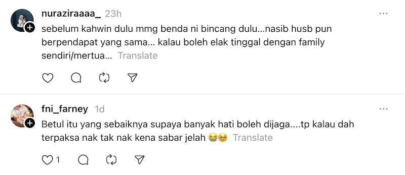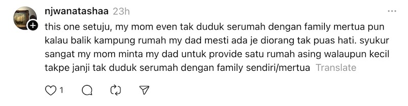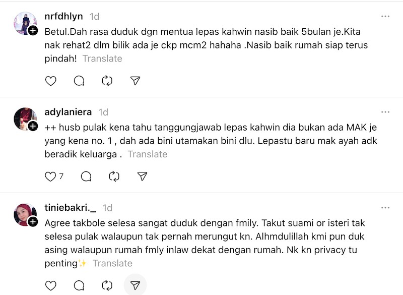 Perkongsian tersebut mendapat pelbagai reaksi daripada pengikutnya yang rata-rata bersetuju dengan kenyataan itu, sambil berkongsi pengalaman masing-masing tentang cabaran hidup sebumbung dengan keluarga mertua.