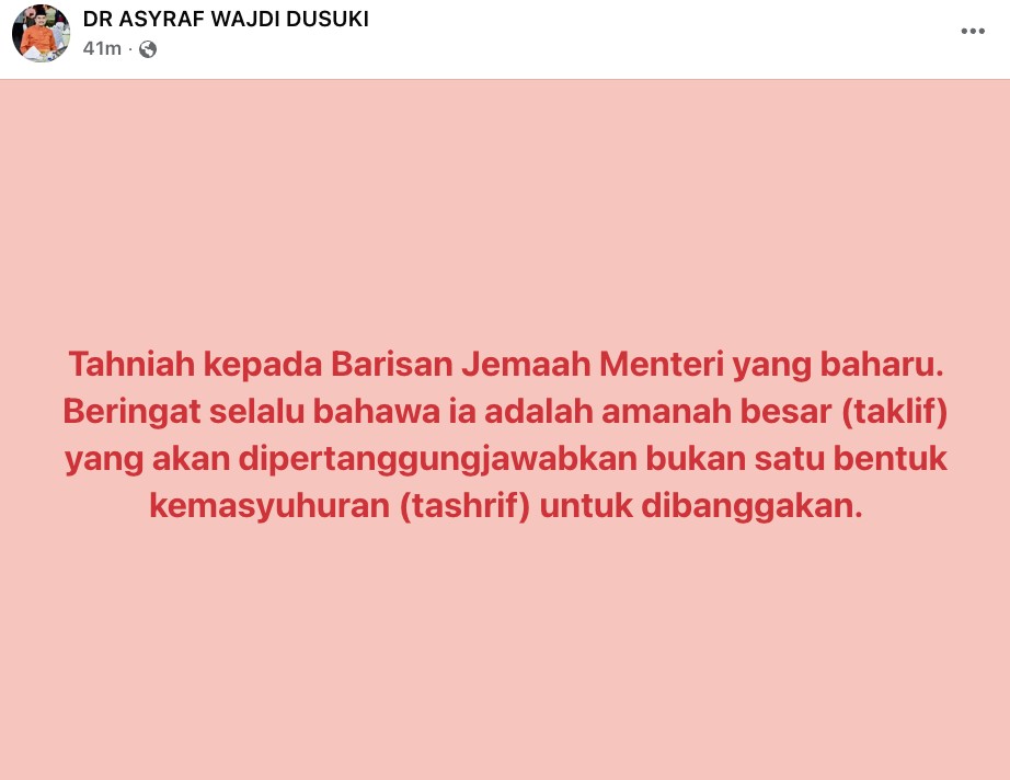 Asyraf Wajdi ucap tahniah kepada Jemaah Menteri baharu -“Ia adalah amanah besar…”