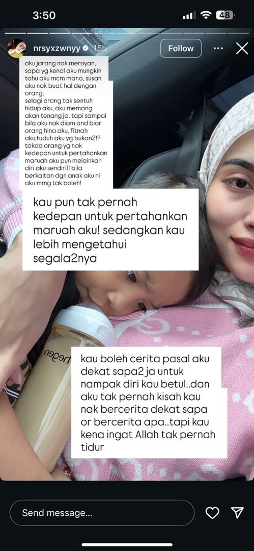 Dalam satu hantaran lain, beliau menegaskan dirinya terpaksa bersuara demi mempertahankan maruah serta menepis fitnah yang didakwa dilemparkan terhadapnya.