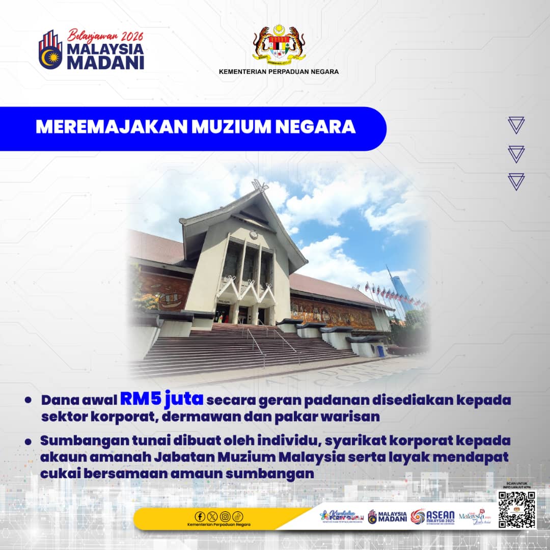 Selain itu, dana awal geran padanan disediakan bagi meremajakan Muzium Negara melalui sokongan sektor korporat, dermawan dan pakar warisan sebanyak RM5 juta.