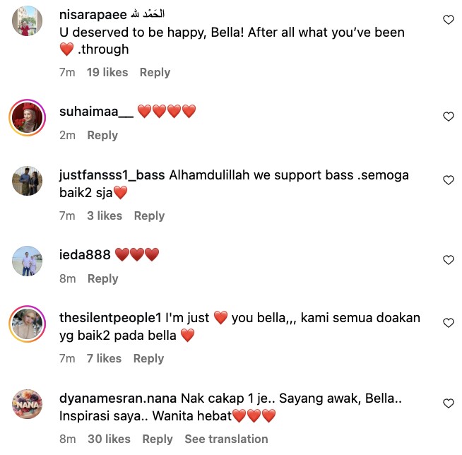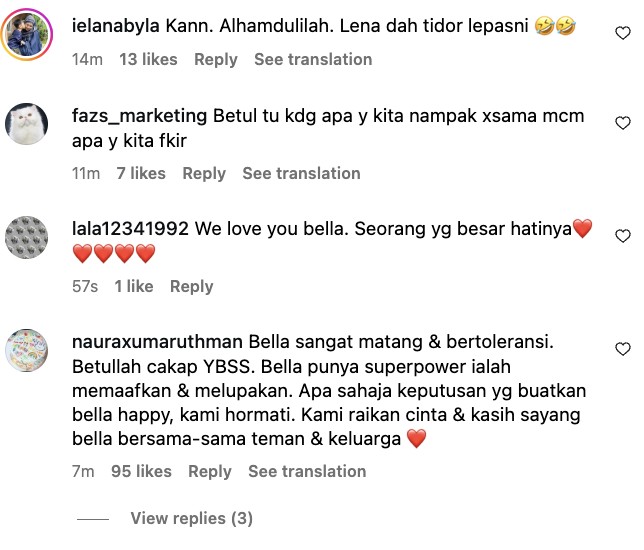 Dalam posting tersebut, Bella meluahkan rasa syukur apabila masalah yang dikatakan sebelum ini telah diselesaikan secara bersama dan menyatakan sebenarnya tidak ada sebarang perkara tidak baik berlaku antara mereka.