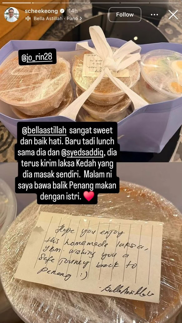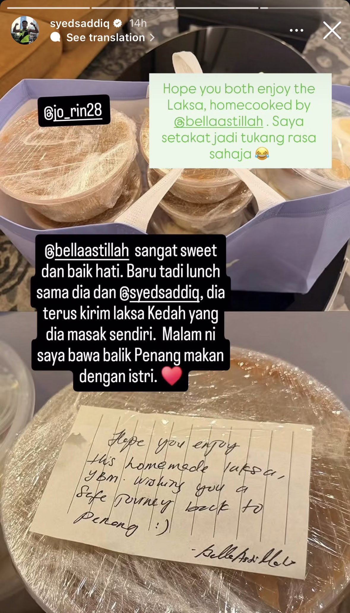 “Bella Astillah sangat sweet dan baik hati. Baru tadi makan tengahari dengan dia dan Syed Saddiq. Dia terus kirim laksa Kedah yang dia masak sendiri.