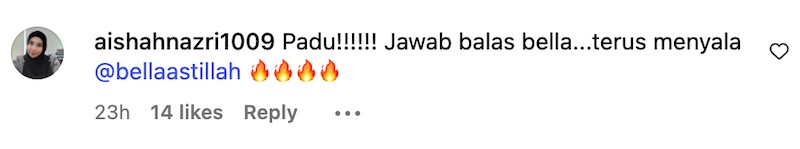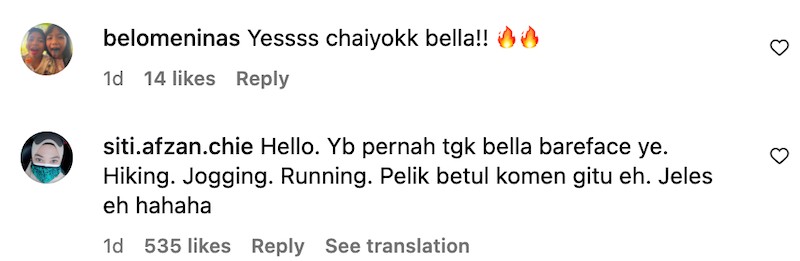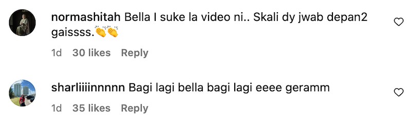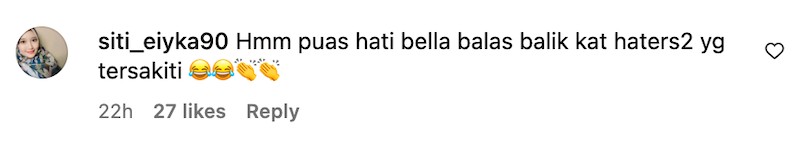 Menjengah ke ruangan komen, rata-rata netizen berpuas hati apabila Bella akhirnya tampil mempertahankan diri, memandangkan sebelum ini dia memilih untuk berdiam diri dan tidak melayan komen negatif.