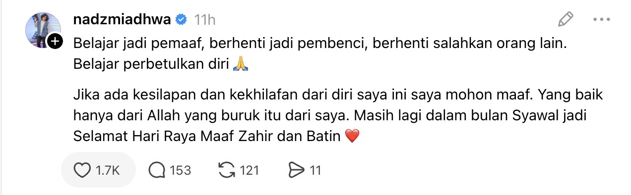 Mengambil semangat bulan Syawal, Nadzmi juga mengucapkan Selamat Hari Raya Aidilfitri serta memohon maaf zahir dan batin kepada semua.