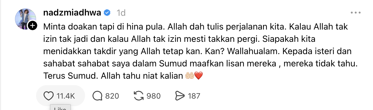 “Minta doakan tapi dihina pula. Allah dah tulis perjalanan kita. Kalau Allah tak izin tak jadi dan kalau Allah tak izin mesti takkan pergi. Siapakah kita menidakkan takdir yang Allah tetapkan. Kan? Wallahualam,” katanya.