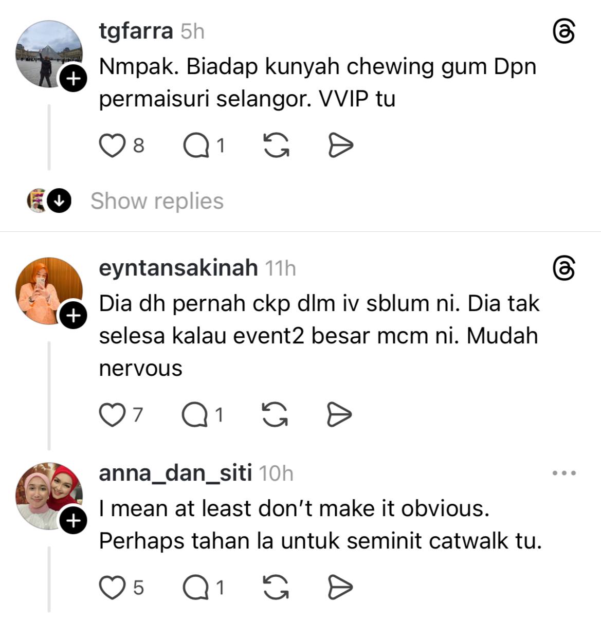 Namun, tindakannya mengunyah ‘sesuatu’ didakwa gula-gula getah semasa pertunjukan fesyen berkenaan telah menimbulkan rasa kurang senang orang ramai dan menganggapnya tidak menghormati majlis lebih-lebih lagi melibatkan orang-orang kenamaan.
