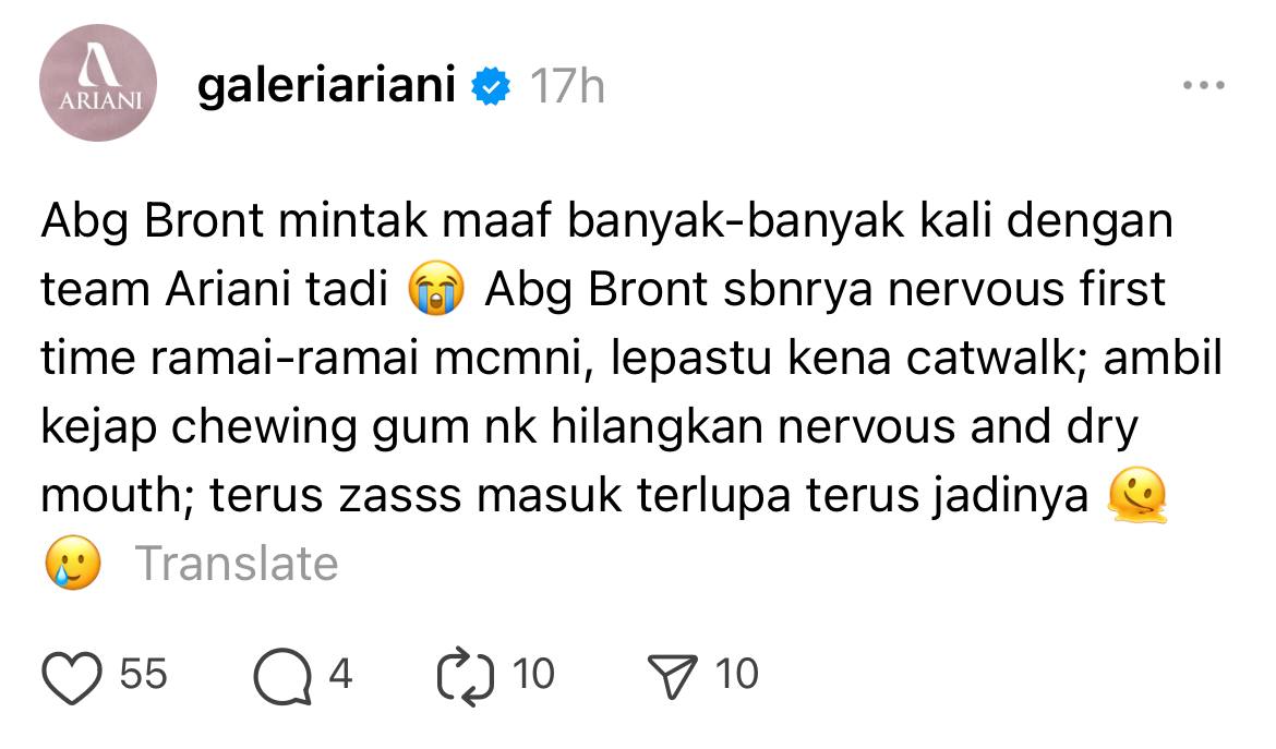 “Abang Bront sudah beberapa kali memohon maaf kepada pasukan Ariani. Ini pengalaman pertama beliau berdepan khalayak yang ramai dan perlu melakukan ‘catwalk’.