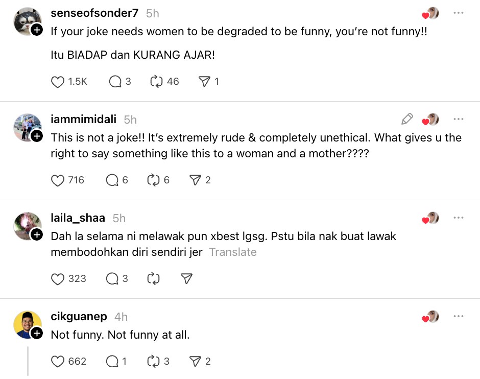 Susulan kenyataan itu, ramai netizen tampil mengecam dan menyifatkan gurauan tersebut sebagai tidak wajar, tidak sensitif serta mencemarkan maruah seorang wanita.