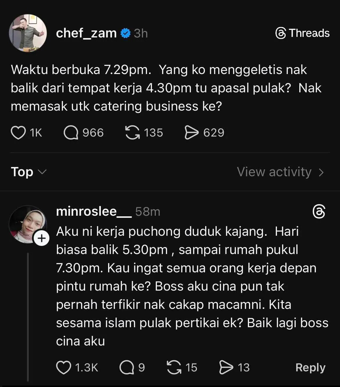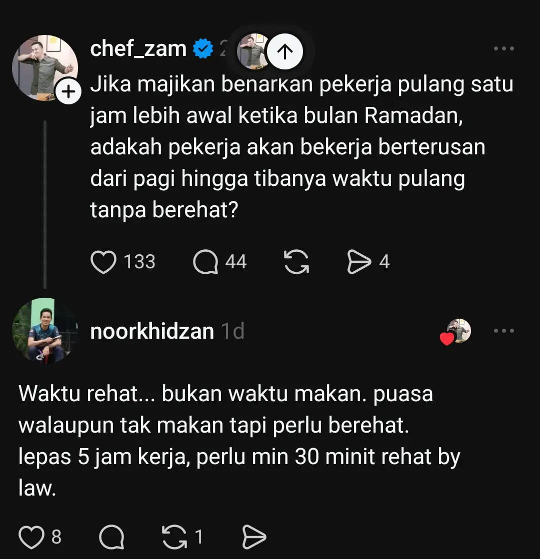 Chef Zam berkata demikian sebagai respons terhadap kecaman netizen susulan luahannya mengenai sikap sesetengah pihak yang tergesa-gesa untuk pulang ke rumah selepas waktu bekerja sepanjang Ramadan.