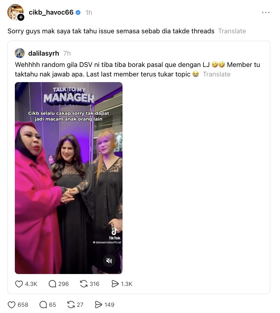 “Sorry guys mak saya tak tahu is semasa sebab dia tak ada Threads,” tulis Cik B.