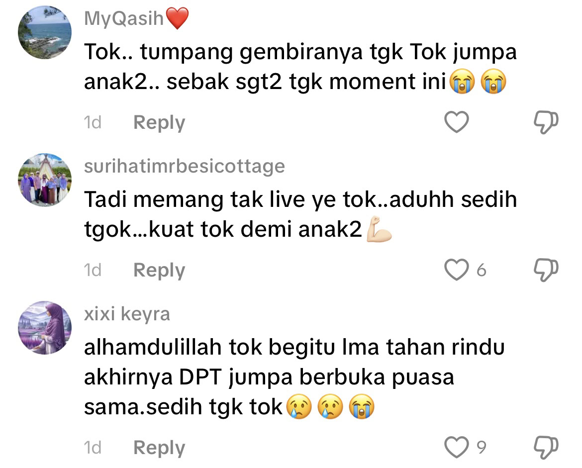 Meninjau ke ruangan komen, waraganet sebak melihat momen tersebut dan mendoakan agar urusan usahawan itu dipermudahkan supaya dapat membesarkan anak hinga ke hujung usia.
